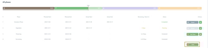 By modifying the Actual Start Date of a phase, you also adjust the Actual End Date of the preceding phase, with the exception of the Harvest Phase, where both dates can be changed independently.