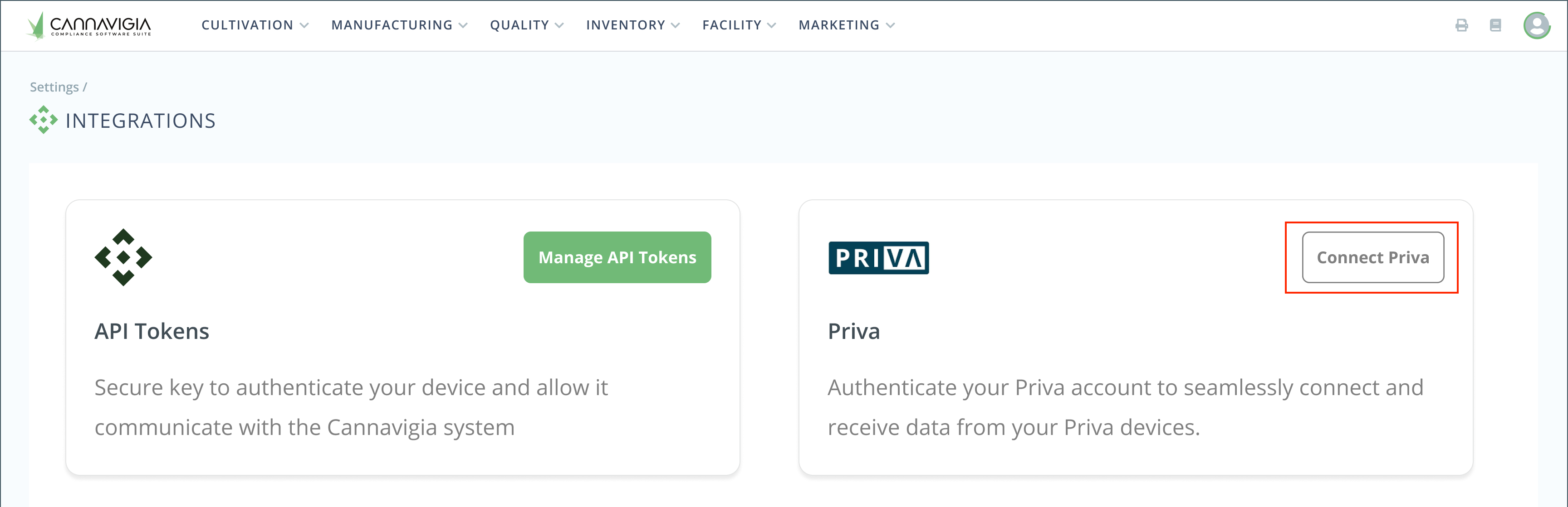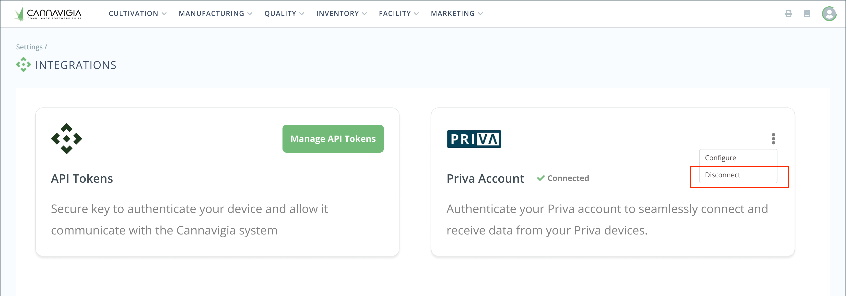 Find the Priva integration, click on the three dots, and choose "Disconnect."