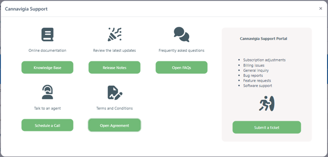 The Cannavigia Support Portal provides quick access to documentation, updates, and support resources.